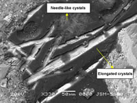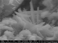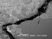 一旦反應(yīng)被激活可以沿著混 凝土的裂縫看到粗糙長(zhǎng)晶體 和細(xì)小針狀晶體的生成。晶 體完全封堵住裂縫,降低混 凝土滲透性,提供防水保護(hù) | BEI拍攝的與上圖相同 裂縫表明澎內(nèi)傳系統(tǒng) 生成晶體正在密封該裂縫 | 放大的圖片清楚地顯示 裂縫中的粗糙長(zhǎng)晶體 和細(xì)小針狀晶體 | 放大10,000倍后可以看到 這些晶體是怎么形成的 |