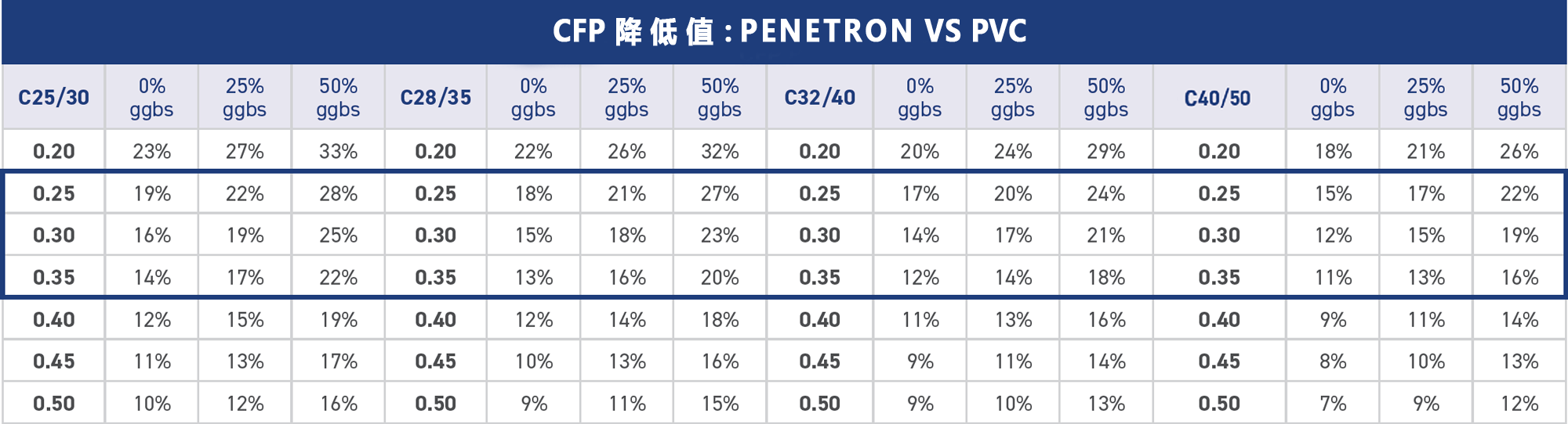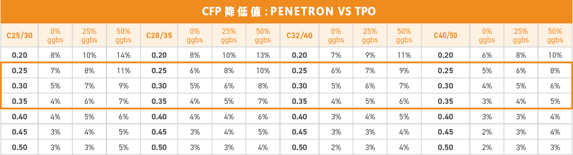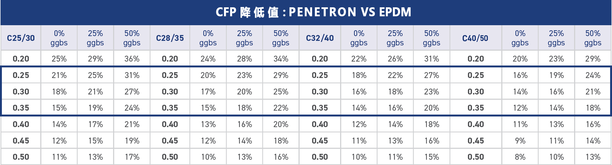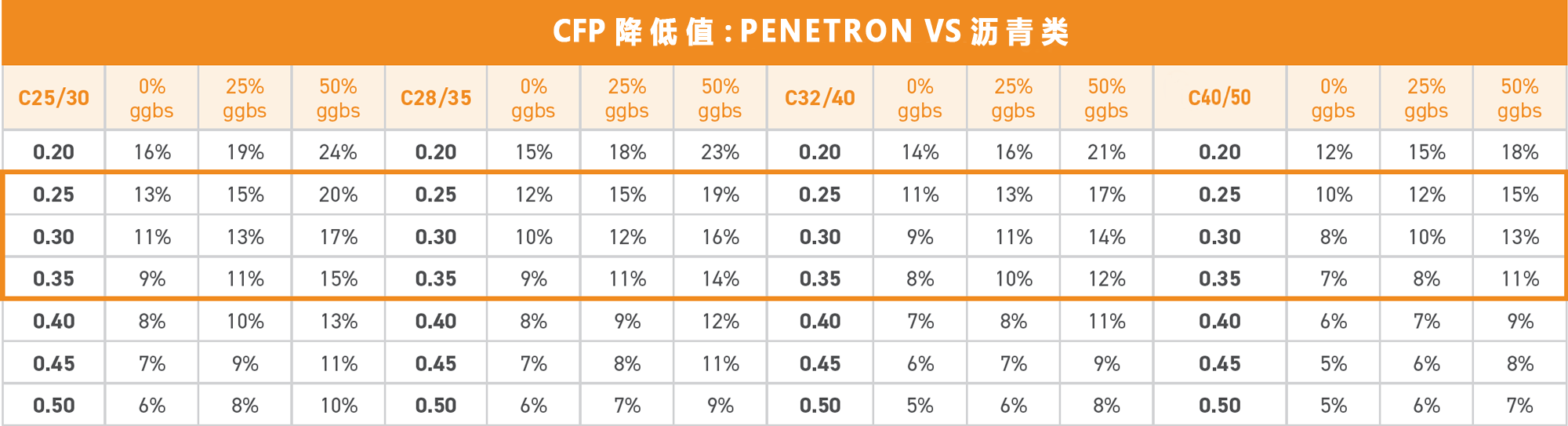 按照結構平均厚度0.25-0.35m計算每平方米混凝土的CFP,將PENETRON ADMIX 澎內(nèi)傳混凝土防水添加劑(PNC803)與上述表面處理方案進行比較?,結果見右表。